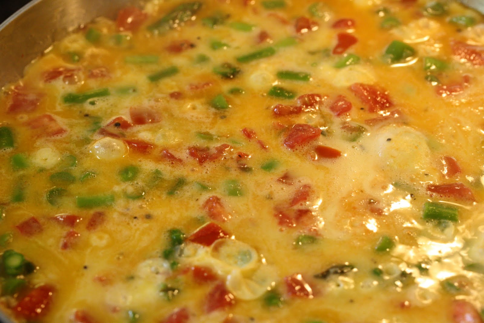 - Pour the egg mixture over the asparagus and cook until the eggs begin to set.