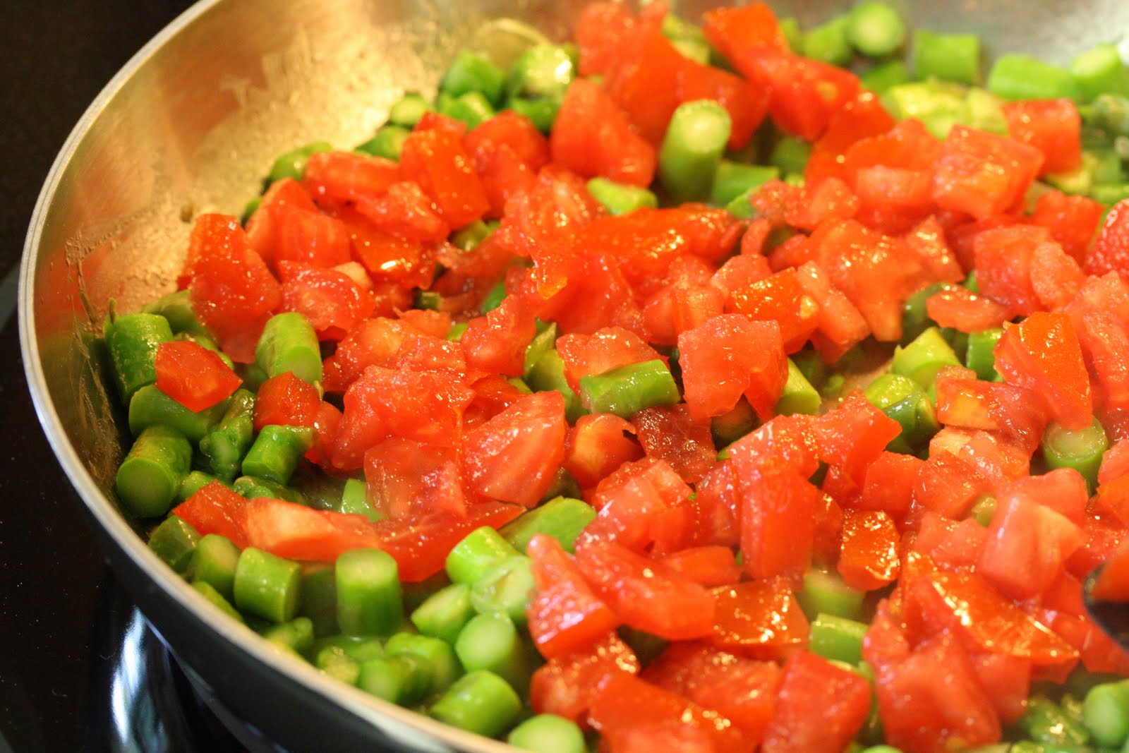 - Heat the olive oil and butter in a 9-½ inch ovenproof skillet over medium heat. Add the asparagus and shallots and saute until crisp-tender. Raise the heat to medium-high and add the tomatoes and a pinch of salt. Cook until heated, about 2 minutes.