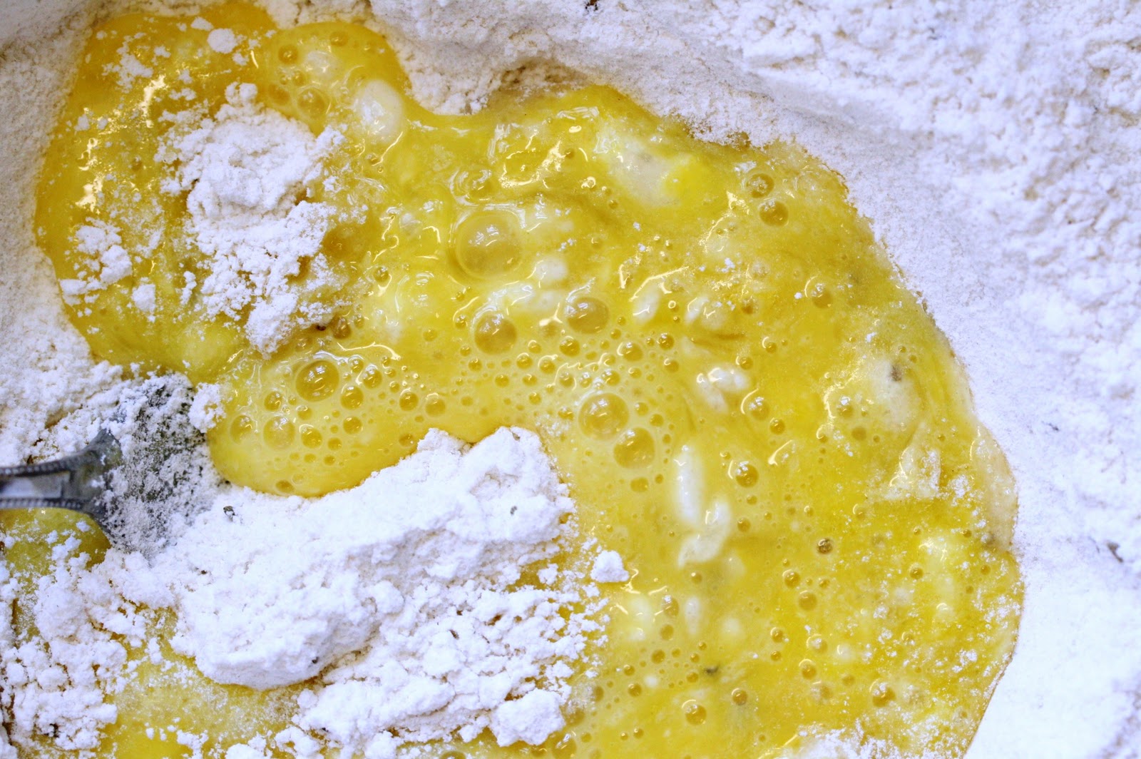 First you should melt the butter and allow it to cool while preparing the other ingredients.ย Combine all dry ingredients (including the Anise Seed)ย and make a well with the flour mixture.