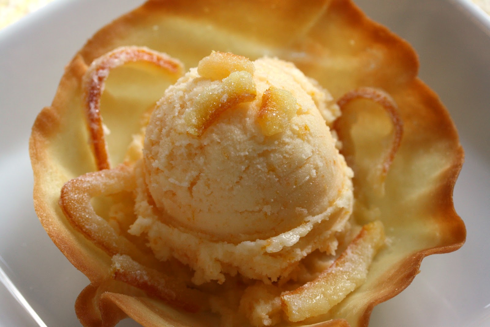 Tricia, I LOVE everything about this post; the sorbet, the tuille cups, the candied orange peel and your photos capture it all so beautifully! I think you get the dessert award of the week!