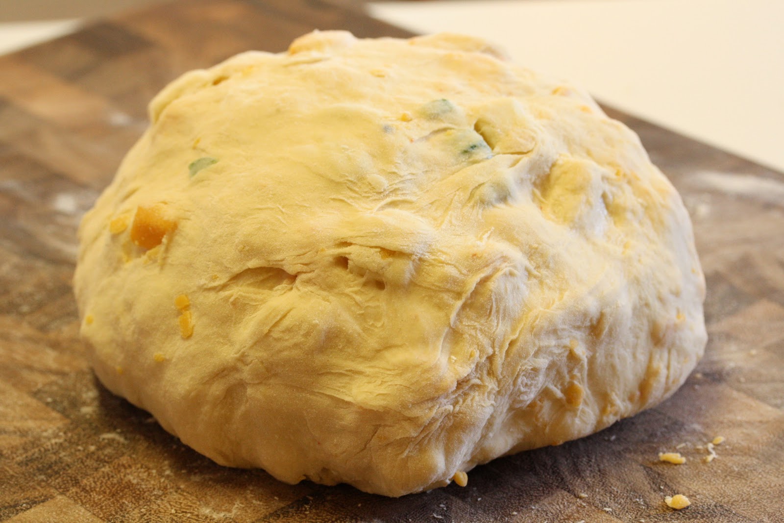 - Remove the dough from the bowl and place it on a lightly floured board. Add the cubed cheese and knead until blended. After incorporating all the cheese, let the dough rest and cover with a tea towel. Allow the dough to rest 10 minutes. Gather the dough and knead gently for 30 seconds.