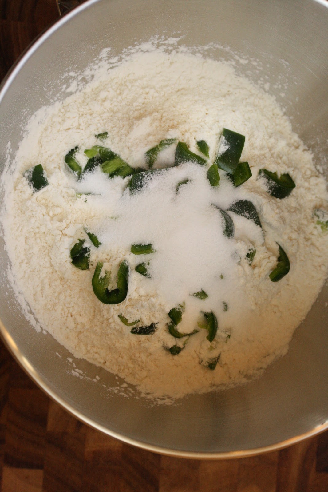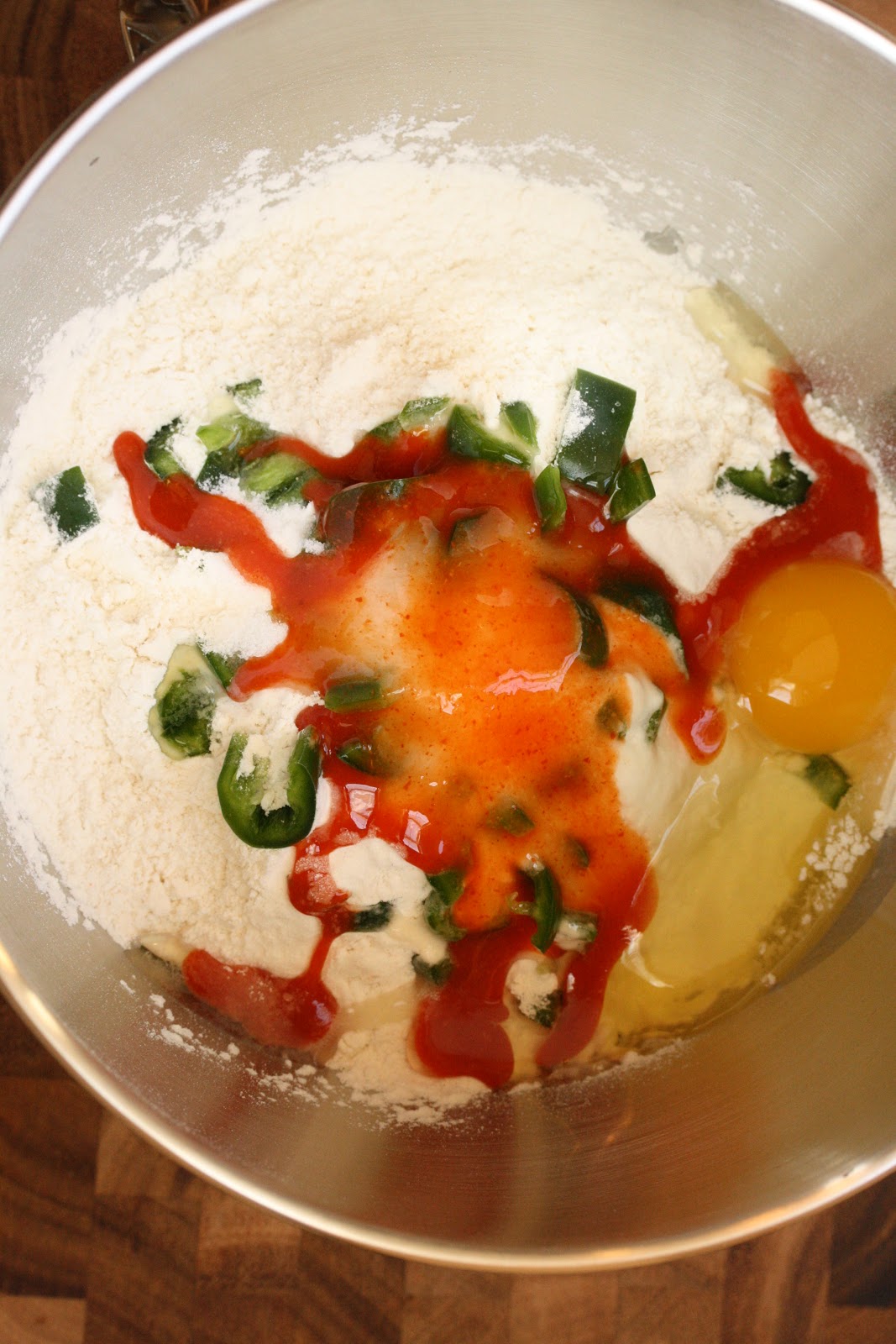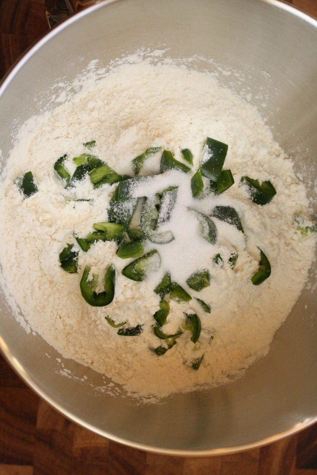 - In a large stainless steel bowl, add 4 cups of flour, chopped jalapenos, salt, sugar, egg, hot pepper sauce and warmed milk. After the yeast has proofed, add it to the bowl and start kneading. Add more flour as needed to create a soft smooth semi-sticky dough. Keep kneading for 10 minutes.