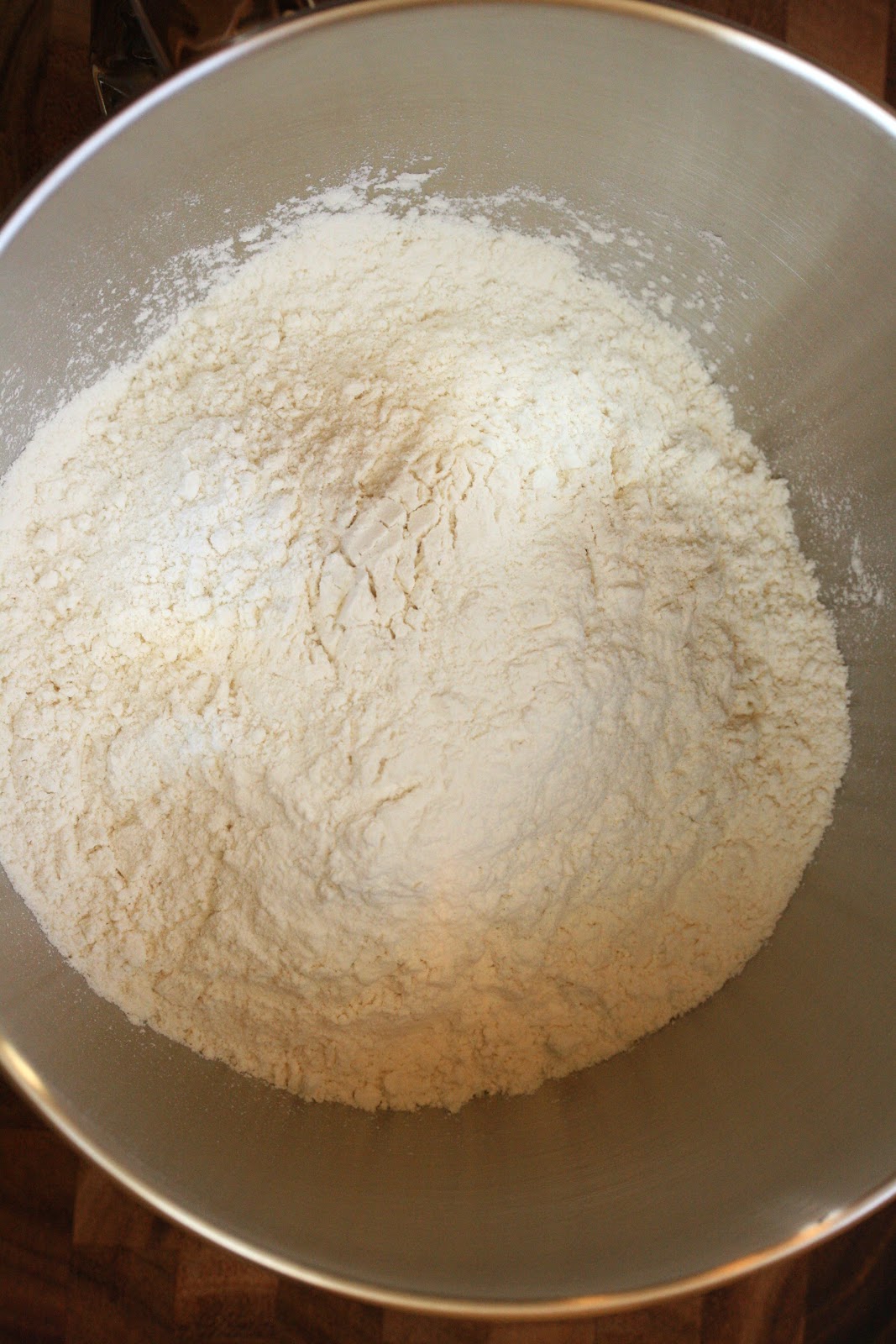 In the bowl of a heavy-duty stand mixer, add 4 cups of bread flour.