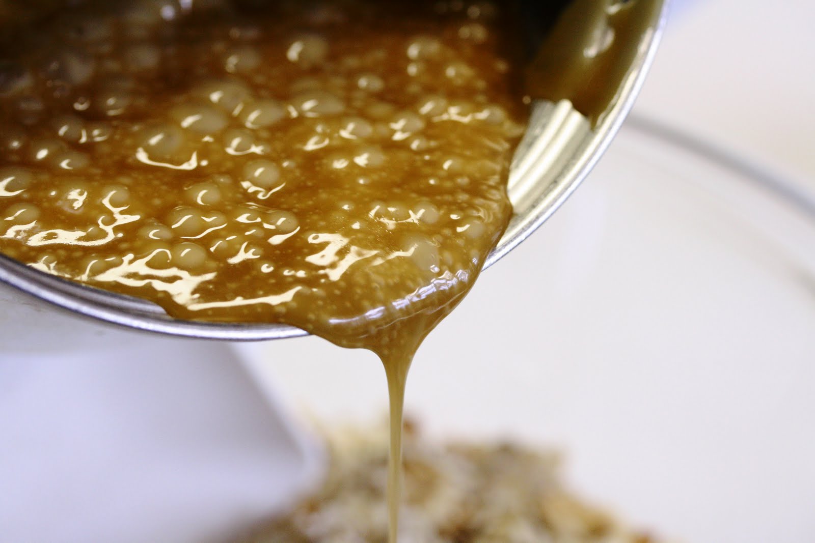 In a small saucepan, blend the brown rice syrup, brown sugar and butter. Cook over medium heat until the mixture starts to boil. Cook 2-3 minutes or until the sugar is completely dissolved. Remove from heat.