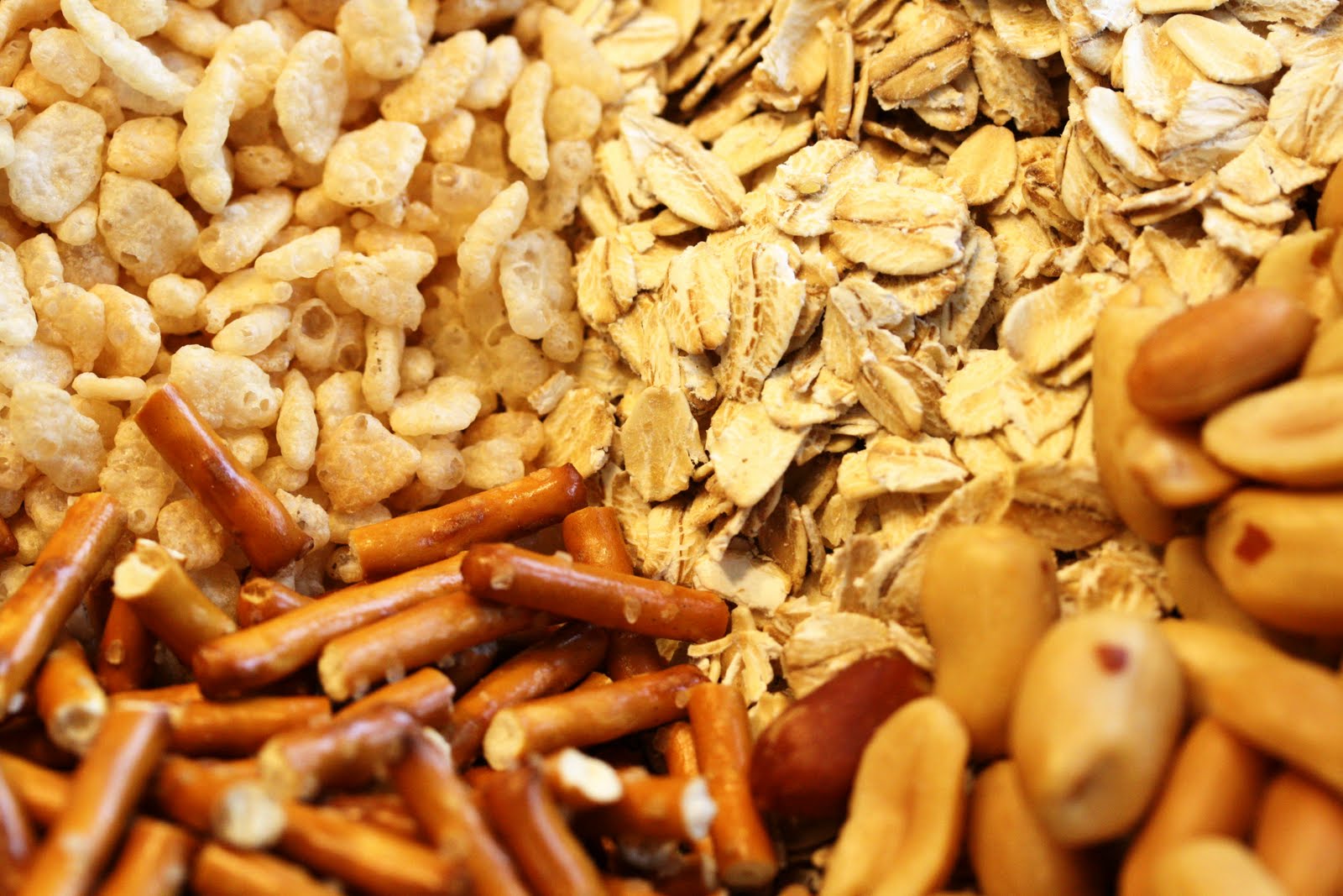 - In a large mixing bowl combine the oatmeal, cereal, peanuts and pretzels.