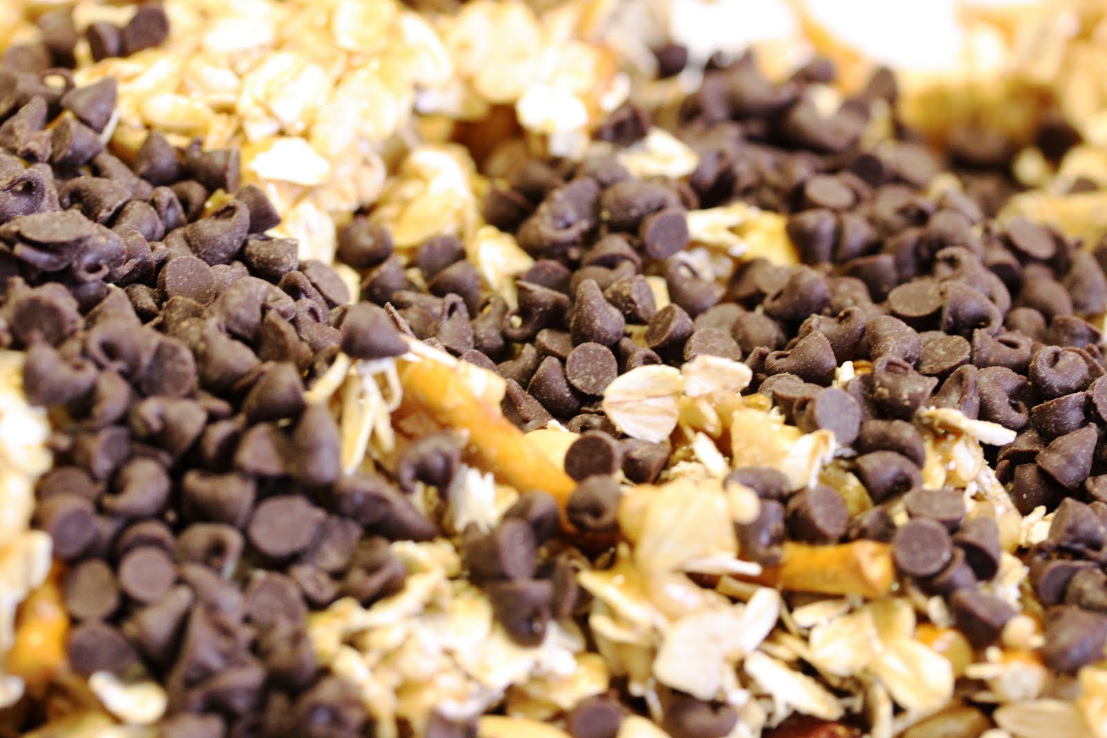 In a large mixing bowl, combine the dry ingredients: cereal, oatmeal, peanuts and pretzels. We’ll add the chocolate chips last.