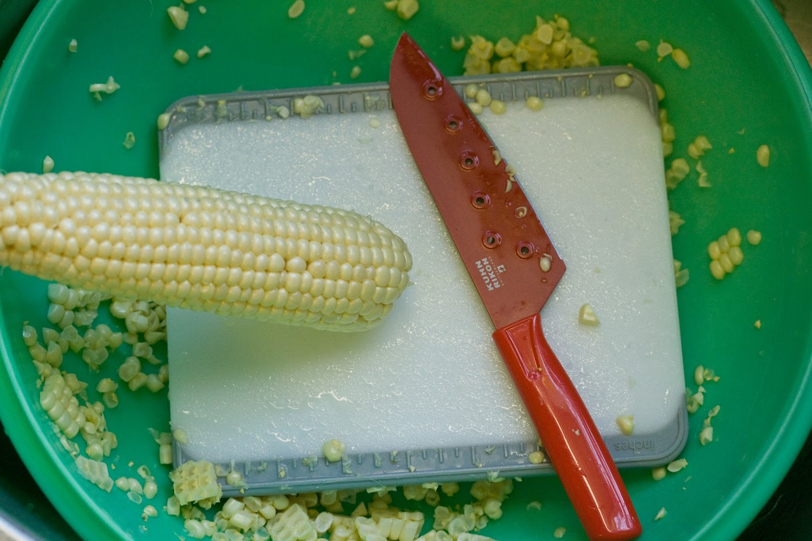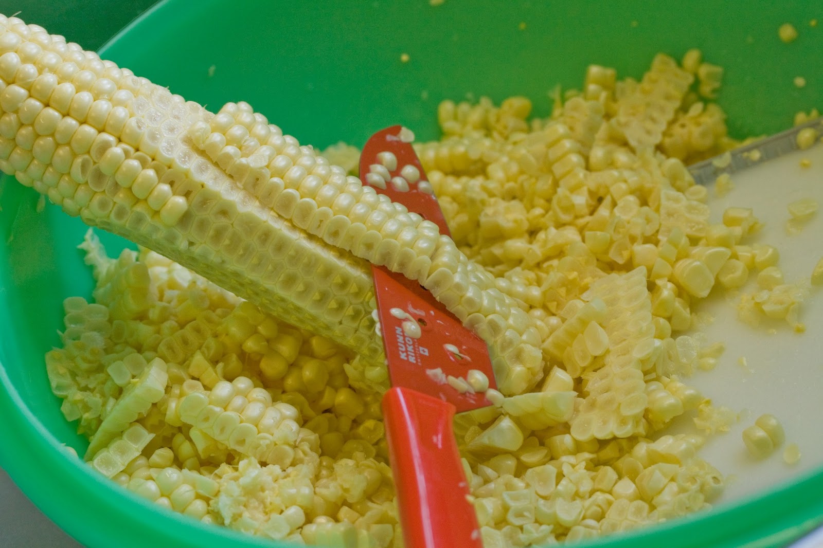 Using a sharp knife cut away the kernels from the cob. Using the blade of the knife or a vegetable peeler, scrape the corn cob to remove the pulp and milk and any remaining kernels.