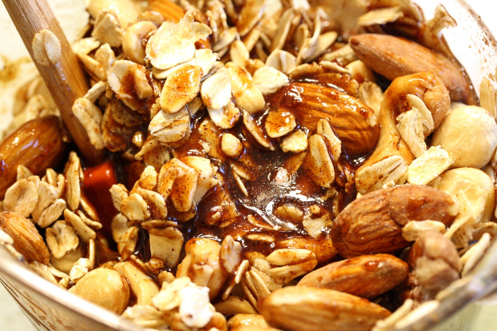 Preheat oven to 300 degrees.ย Mix the oats, salt and nuts together in a large mixing bowl.ย Combine the honey and canola oil inย a large measuring cup.ย Stir in the almond extract, cinnamon and nutmeg.ย Add some of the oat mixture into the honey mixture and stir until well combined.ย Add more oats to the honey mixture until the measuring cup is full and all nuts are well coated.ย Add the honey-coated oat mixture into the large mixing bowl and combine with the remaining oats.