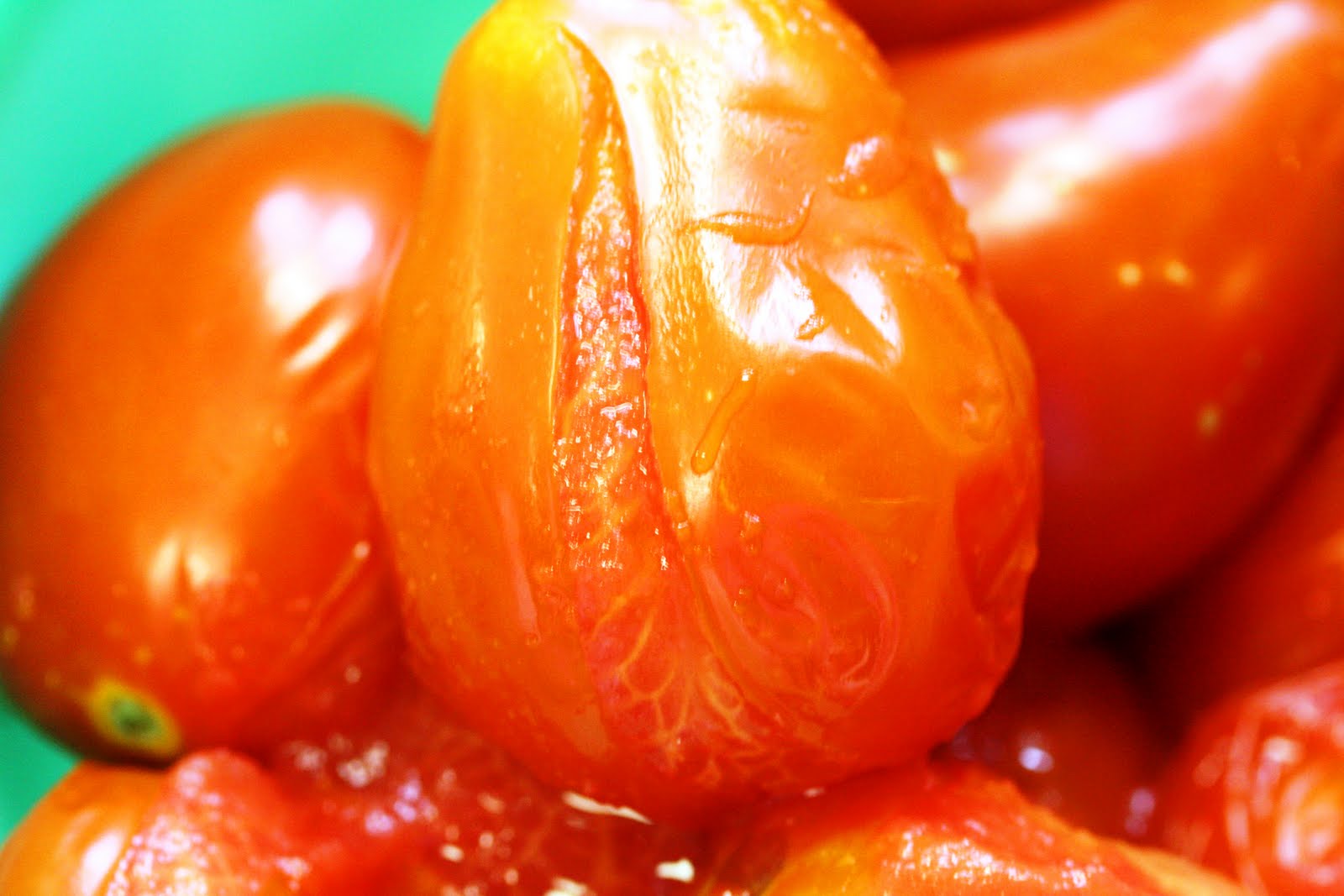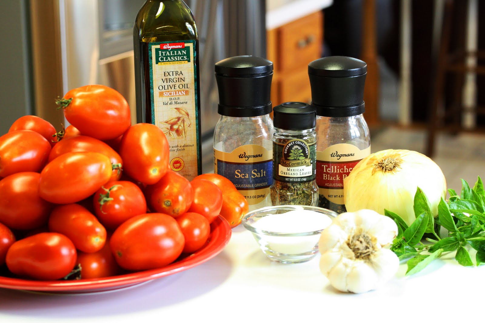 I gathered Roma tomatoes for a few days and ended up with somewhere between 35 and 40 fruits.ย I picked some fresh basil,ย set asideย a big onion, fresh garlic, sugar, salt, pepper and oregano.ย At the endย I also add some red wine and tomato paste (not pictured).
