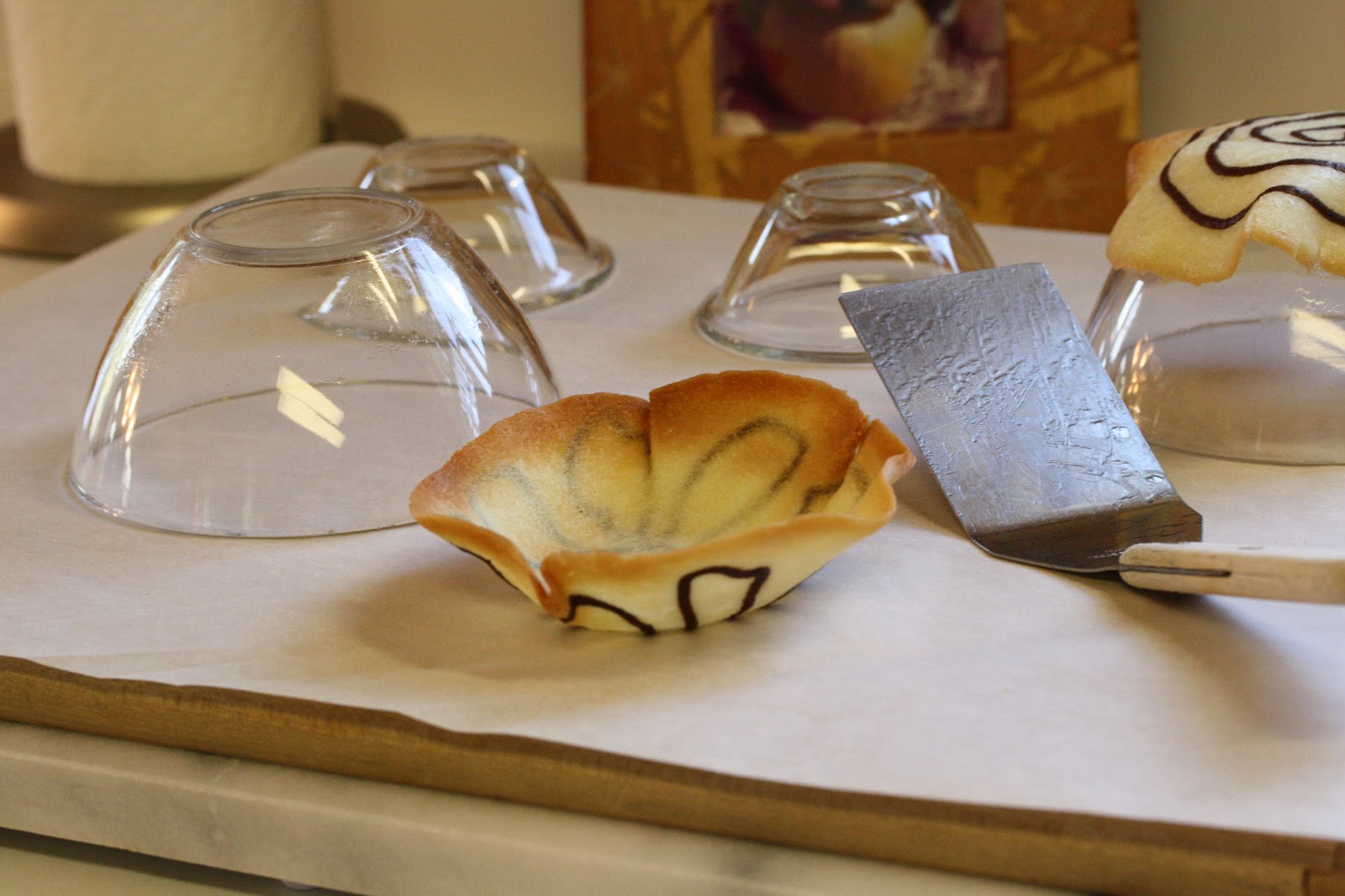 - Bake the tuiles until lightly browned, 8 - 10 minutes. Working quickly remove the tuile from the pan using a large wide metal spatula and lift the cookie over the inverted bowl. Drape a clean paper towel over the tuile and press the sides down around the bowl to mold. Cool until the cookie is set. Remove to a wire rack to cool completely. When making the next batch, do not place the dough on a hot cookie sheet. Work on a cool surface lined with parchment paper and carefully lift the paper onto the cookie sheet when ready to bake.
