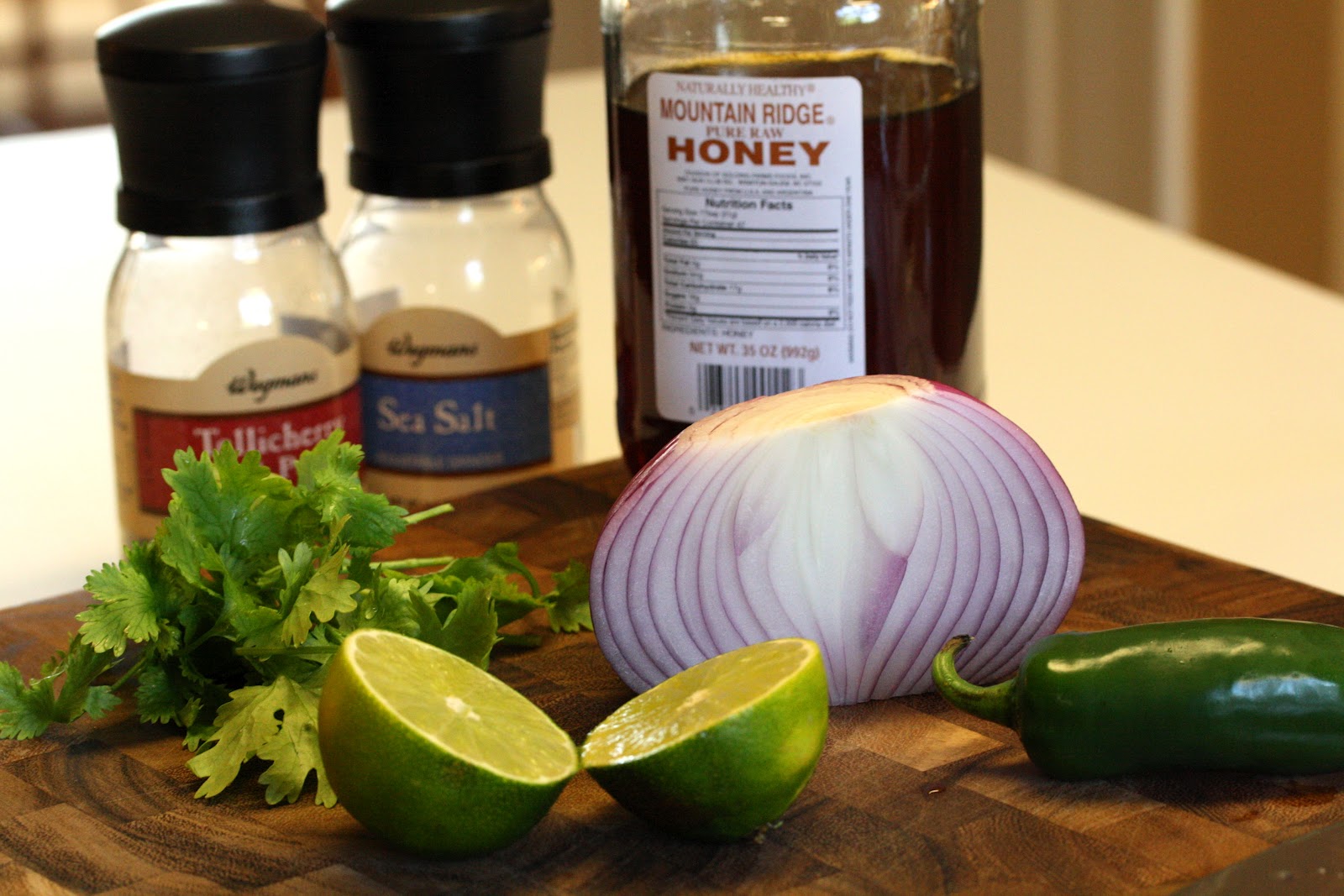 Start with basic salsa ingredients: chopped cilantro, freshly squeezed lime juice, minced onion, a seeded and chopped jalapeno, salt and pepper and mix it up with a little honey, sweetie 🙂 Whisk until blended. Set aside.