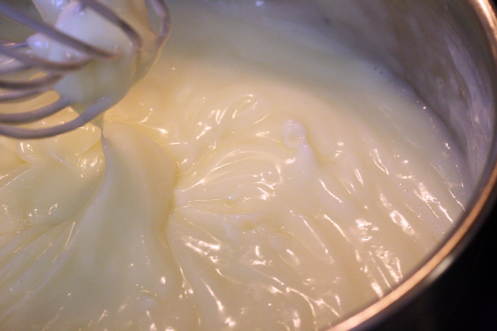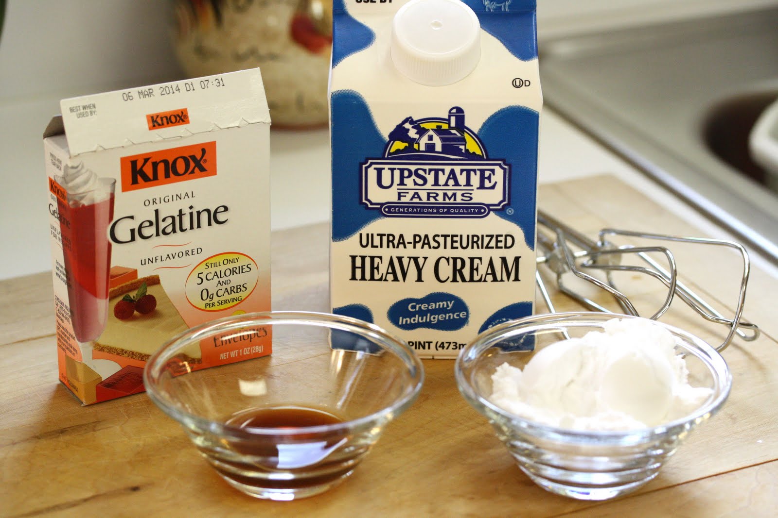 While the gelatin is cooling, beat the heavy whipping cream with the powdered sugar and vanilla.
