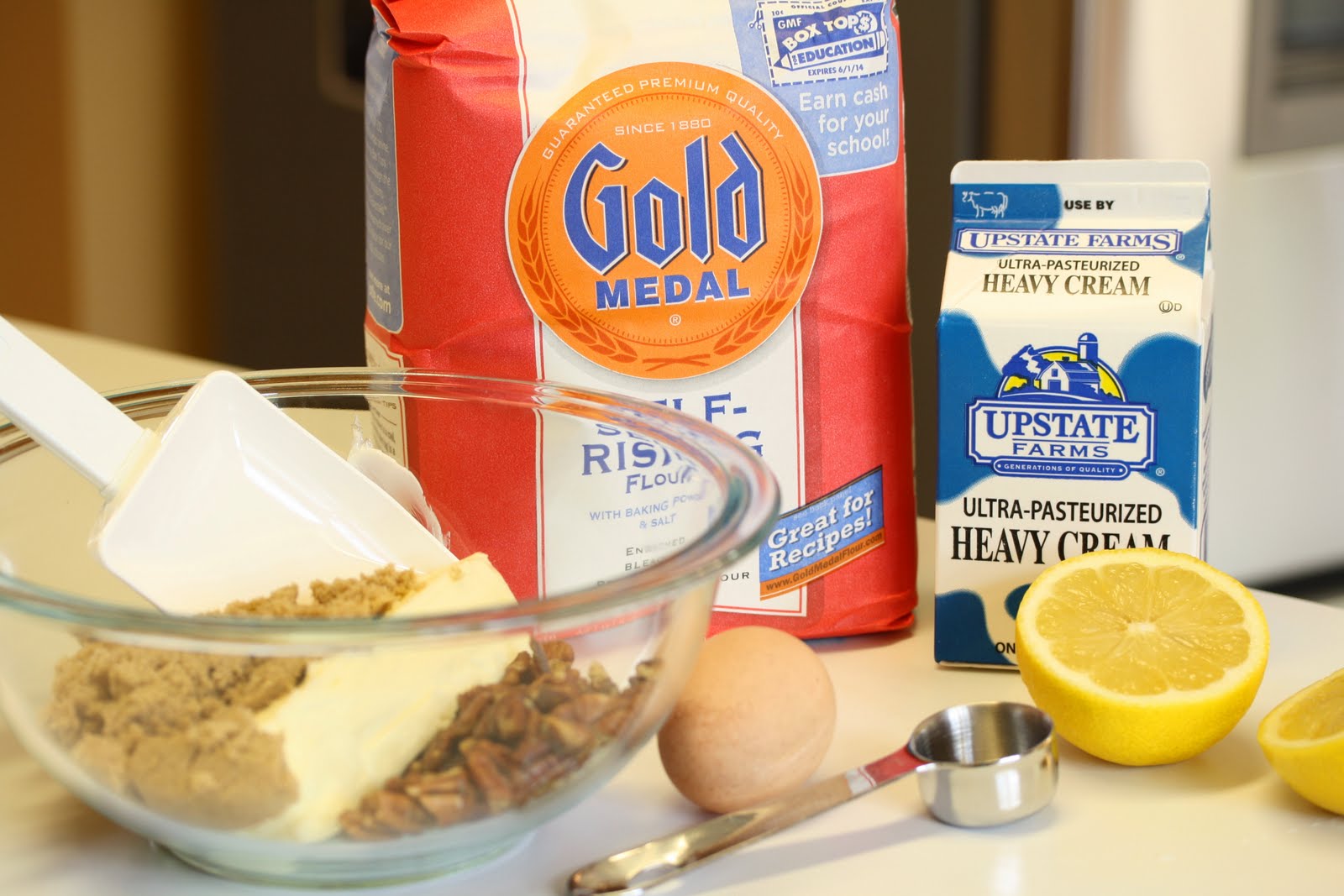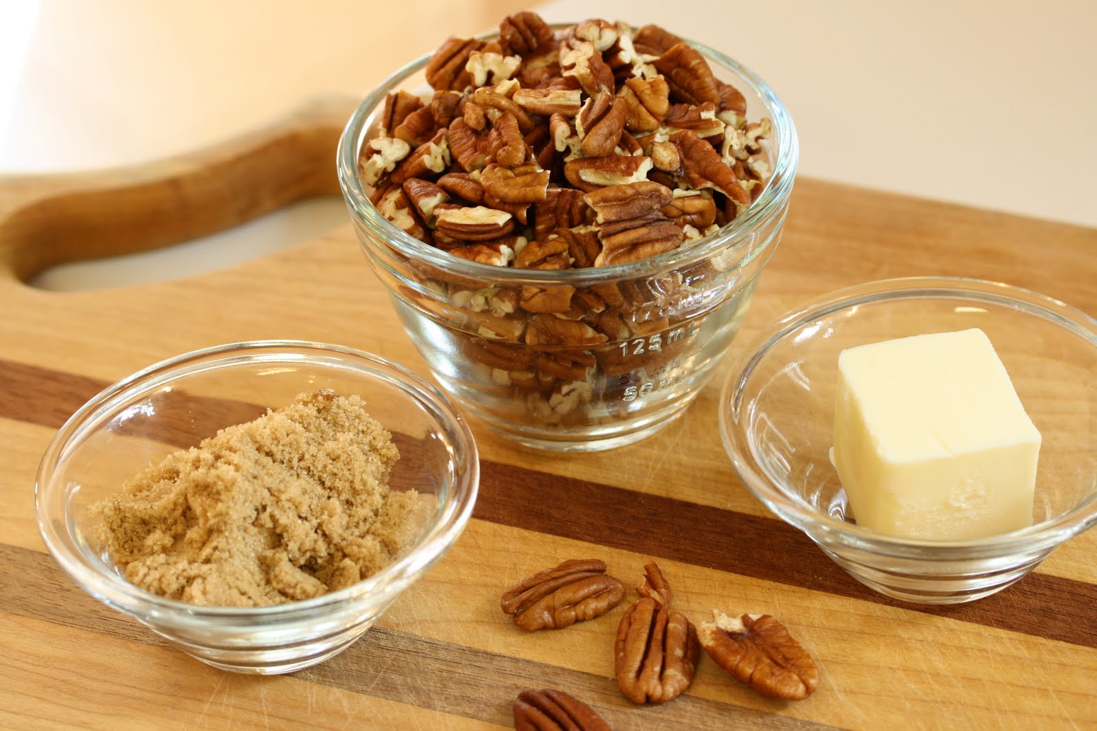 - Melt butter in a small pan on medium-low heat. Add pecans and sugar and stir ingredients until you start to smell roasted nuts. Remove from heat and spread on a piece of parchment paper to cool. Crumble into pieces and set aside.