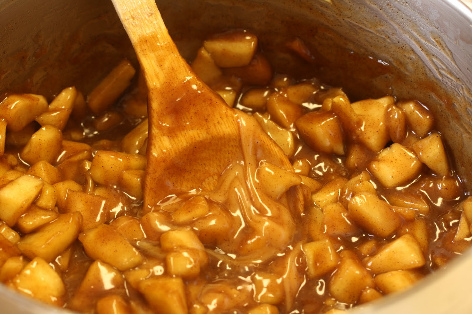 - Cook all filling ingredients in a large heavy bottom saucepan on medium heat. Cook until apples are cooked halfway. Remove from heat and stir in ¾ cup homemade caramel until melted.
