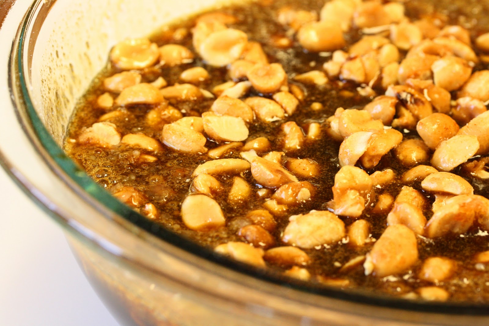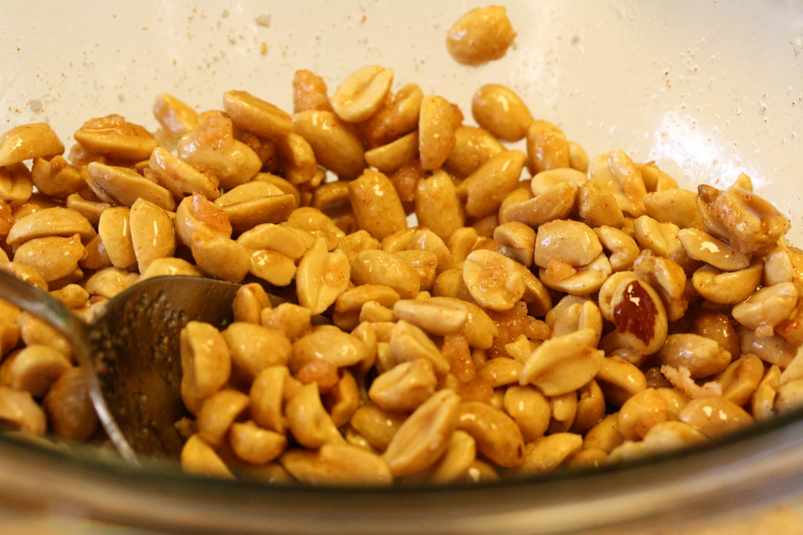Preheat the oven to 350 degrees.ย Line a baking sheet with parchment paper.ย Make a simple syrup by combining the granulated sugar with 3 tablespoons water in a small saucepan.ย Bring to a boil over medium heat.ย Stir to dissolve the sugar and once it begins to thicken remove from heat.ย Add the cayenne pepper and salt and stir to combine.ย Quickly add the peanuts and coat with the syrup.ย Spread the peanuts in a single layer on the parchment paper and bake for 10 minutes in the oven.ย The peanuts should be somewhat dry.ย Remove from the oven and immediately place the peanuts on a plate to cool.ย Once cooled, chop and set aside.