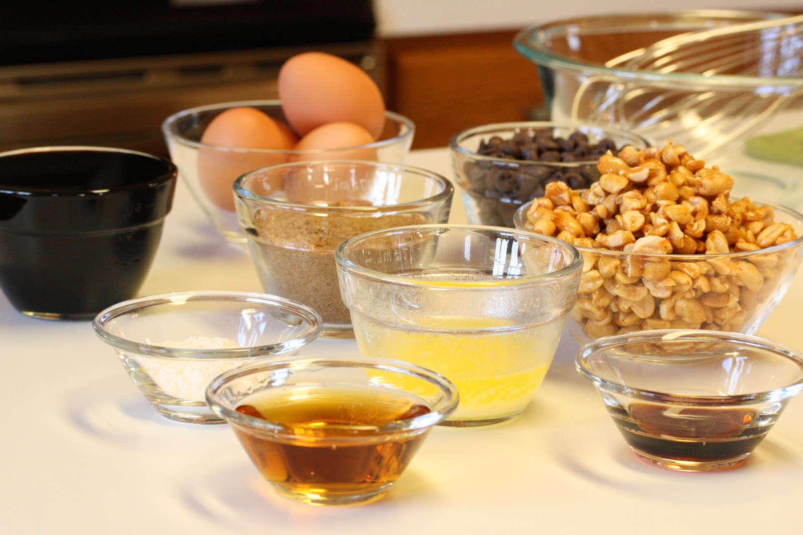 Once cooled, chop the peanuts and set aside.ย Gather all the other ingredients.ย You will need a pre-baked single pie crust, molasses or bark corn syrup, eggs, brown sugar, chocolate chips, melted butter, vanilla, flour and bourbon (optional).