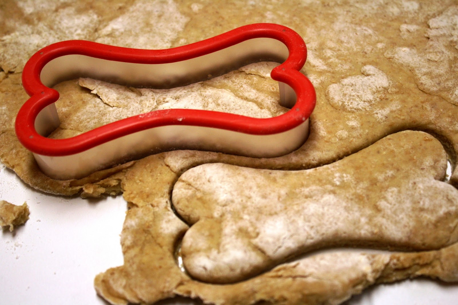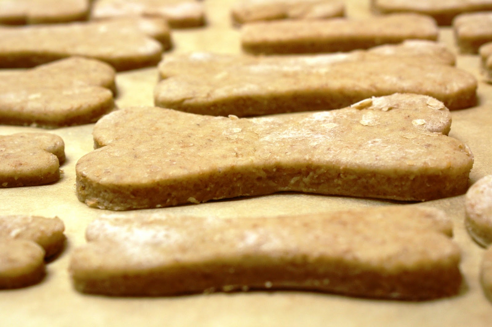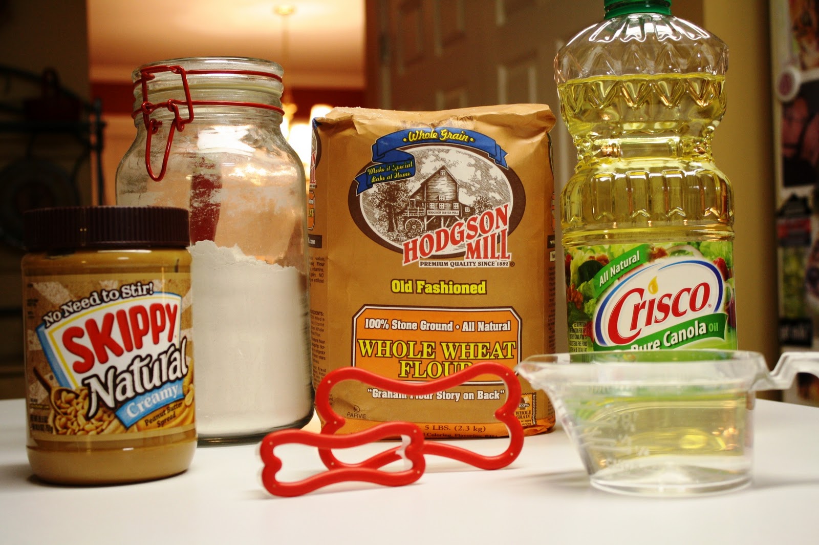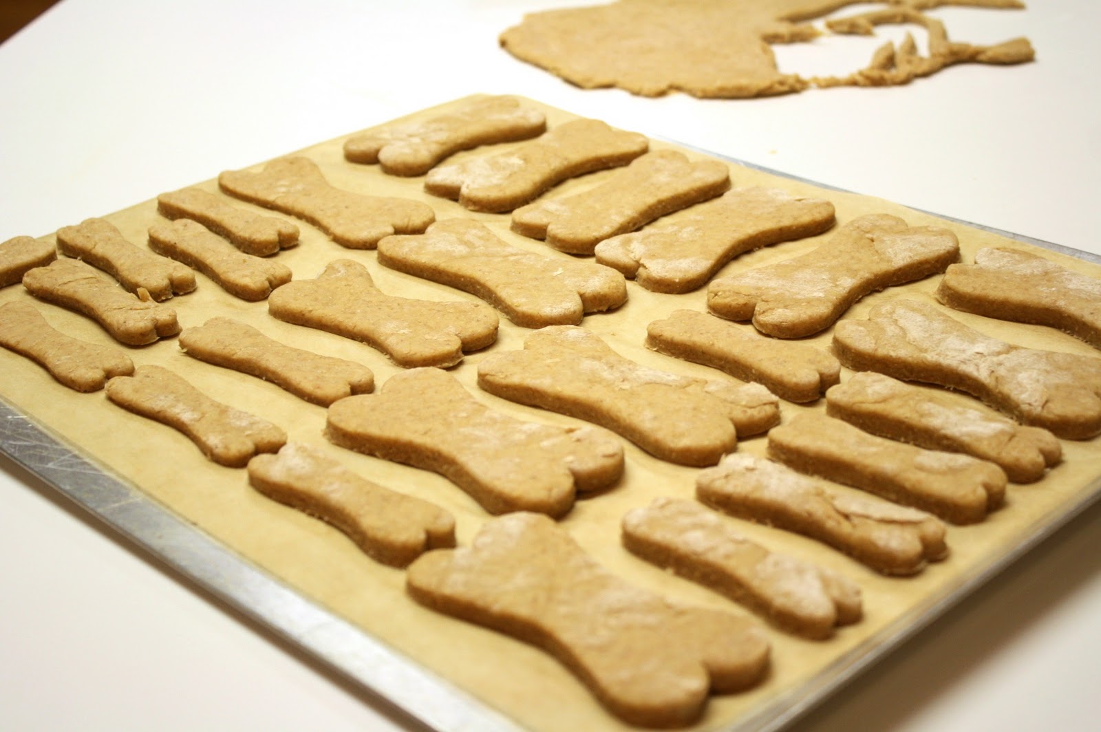 Preheat oven to 350 degrees.ย Combine oil, peanut butter and water.ย Add flour 1 cup at a time, then knead into firm dough.ย Roll dough to 1/4 inch thickness and cut with small bone shaped cookie cutter.ย Bake at 350 degrees for 20 minutes.ย Makes 2 1/2 dozen.
