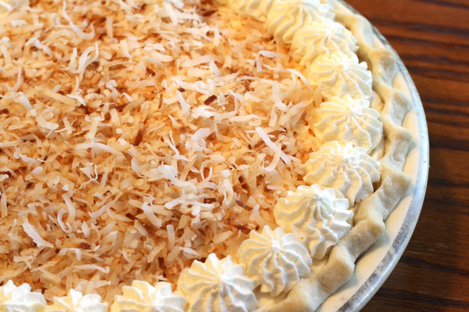 Spread the cooled toasted coconut on the top of the pie.ย Using the pastry bag, pipe a decorative border around the edges.
