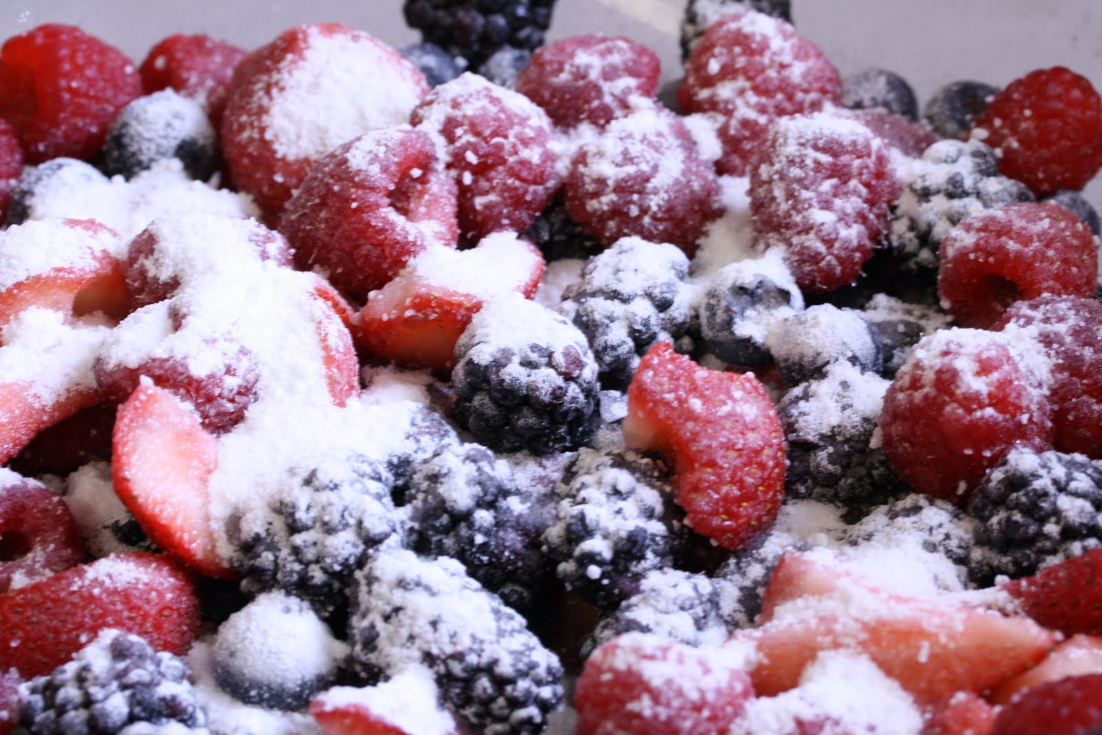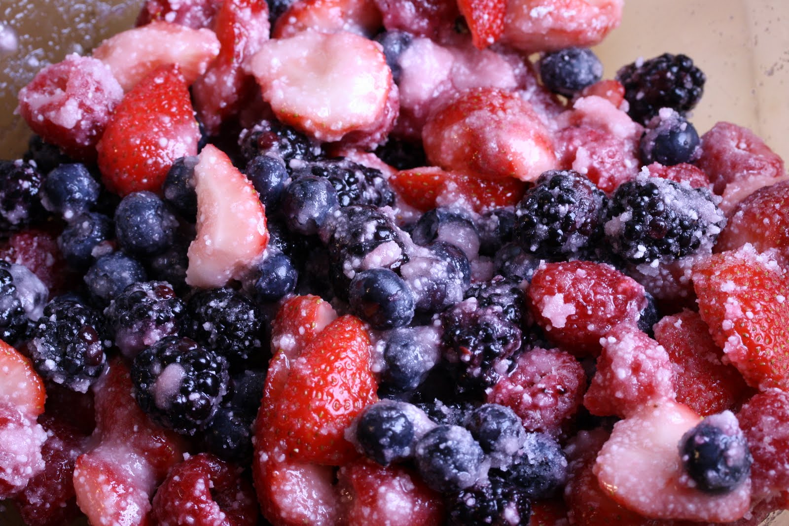 - Combine cleaned and sliced berries in a large mixing bowl. In a small bowl combine sugar, Corn Starch and tapioca. Sprinkle sugar mixture on top of the berries and gently mix to combine. Set aside while making the pie crust.
