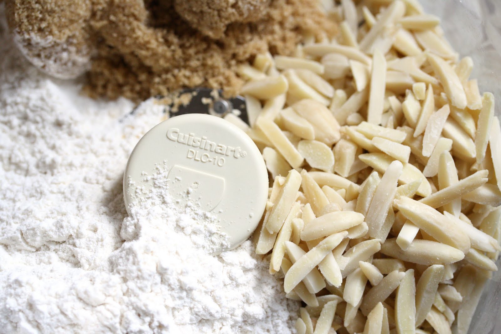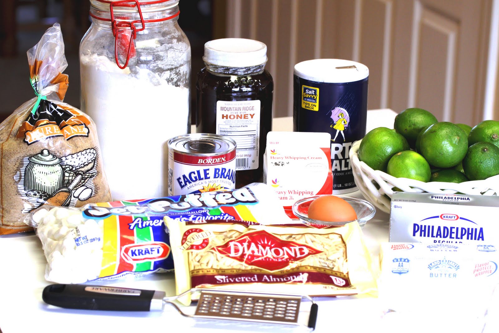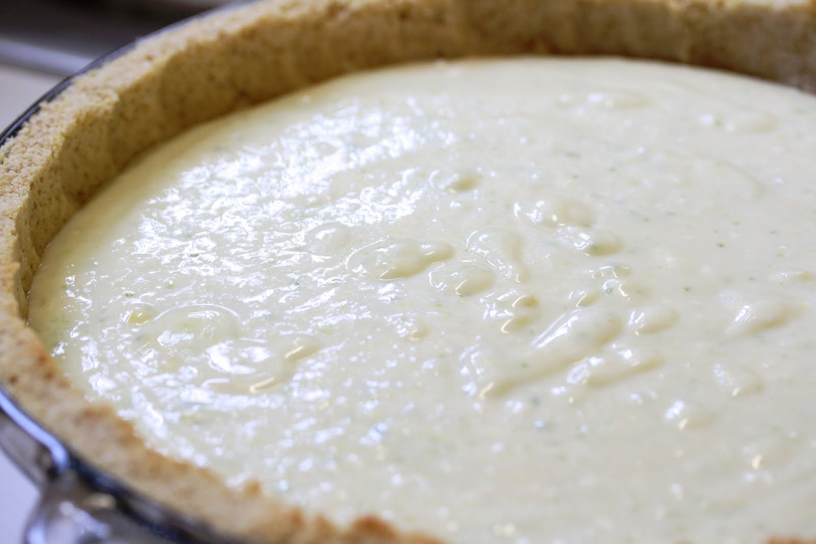 - Combine the flour, brown sugar and ½ cup almonds in a food processor. Process until well blended. Add melted butter and honey and pulse until the mixture crumbly but holds together if pinched. Press mixture onto the bottom and up the sides of a greased 9-inch pie plate. Bake for 8 minutes at 350°F. Cool on a rack while preparing the lime filling.