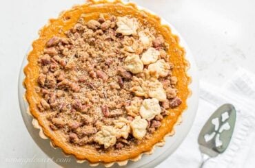 A surprisingly unique and delicious tart with a cream cheese pumpkin base and a sweet, crunchy crumble top loaded with toasted pecans.