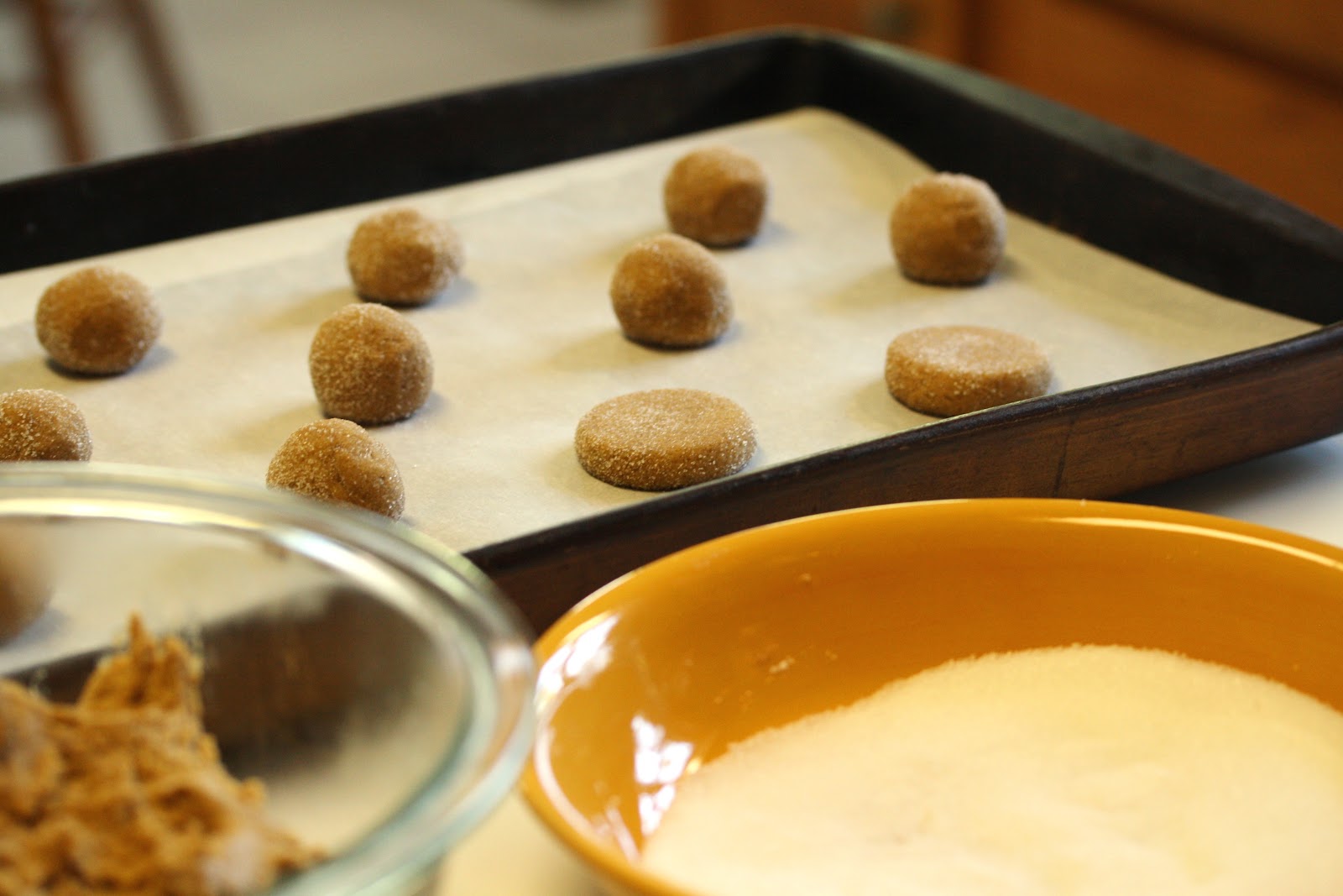 - Place 1 cup of granulated sugar in a shallow bowl. Roll dough into 1 inch balls, then roll in the granulated sugar until covered. Place each dough ball on a cookie sheet about 2 inches apart. With the bottom of a glass, flatten the cookies slightly.