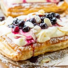 To serve, divide the lemon cream mixture on top of the pastry shells. Top each with the blueberry mixture and toasted sliced almonds. Dust with powdered sugar and serve immediately.