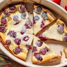 Cool the clafoutis for 15-20 minutes and serve warm dusted with powdered sugar and soft whipped cream if desired.