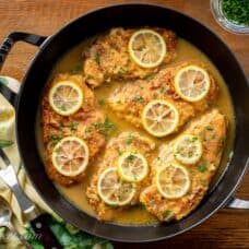 Add the chicken cutlets to the sauce and heat gently for 4 to 5 minutes, turning once, or until heated through. Top the chicken with sautéed lemon slices and garnish with minced parsley and plenty of fresh ground black pepper. Serve immediately.