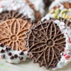 Heat your pizzelle iron until a drop of water sizzles on the cooking surface. Lightly coat the hot iron with nonstick cooking spray. Scoop the batter into a pipping bag fit with a large tip (or cut the corner from a ziplock bag) I used a large Wilton 2A tip.