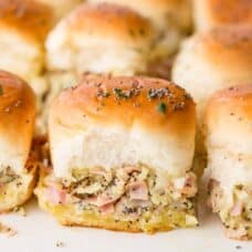 Slice the rolls in half lengthwise and place cut side up in a 13x9-inch baking pan lined with parchment or place on sheets of foil large enough to cover the rolls. Divide the ham mixture equally on top of the three pans of rolls. Cover with the top half of the rolls. Cover with a double thickness of foil to seal. (If desired, seal and refrigerate or freeze at this point.)