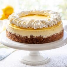When the cheesecake is cool, spread the lemon curd on top of the cheesecake leaving a 1-inch border around the edge. Cover tightly with plastic wrap and refrigerate overnight, or up to 24 hours.