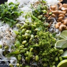 To serve, pour the onion mixture over the rice noddles, add the cashews, sesame seeds, lime zest and cilantro. Toss lightly and serve with lime wedges. Salt to taste