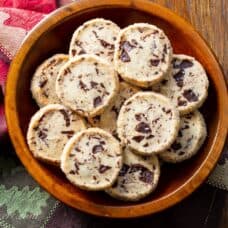 Classic delicious buttery shortbread cookies filled with chunks of rich semi-sweet chocolate, plenty of vanilla and a crisp coating of coarse sugar around the edges
