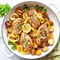 Push the chicken to one side the skillet. On the empty side of the skillet, add the remaining 1 tablespoon butter, garlic and crushed red pepper flakes. Add the potatoes back into the pan and toss in the garlic butter sauce. Cover and cook for 10 minutes, or until the chicken is cooked through (160°F) and the potatoes are tender.