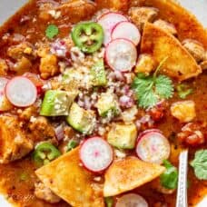 Turn off the slow cooker and remove the bay leaf. Skim any fat from the surface of the soup. Season with salt and pepper to taste and add the juice of 1 lime. Serve with your favorite toppings.
